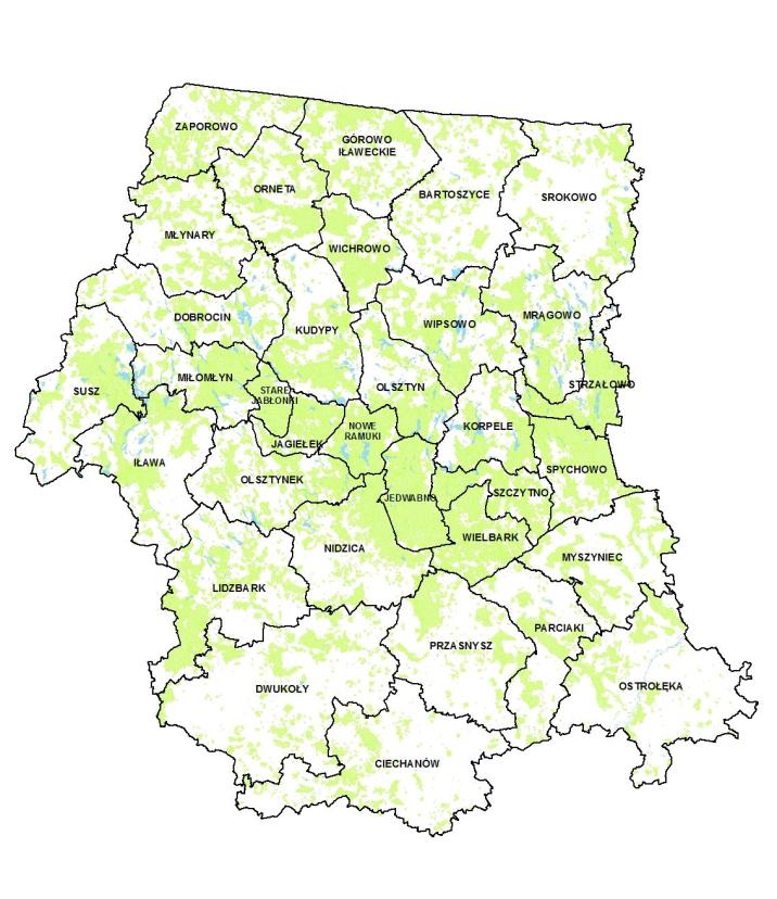 Północna część zasięgu administracyjnego olsztyńskiej dyrekcji jest bardziej urozmaicona. Z powodu większej ilości opadów i żyźniejszych gleb, głównie pochodzenia polodowcowego, występują tu drzewostany liściaste i mieszane.