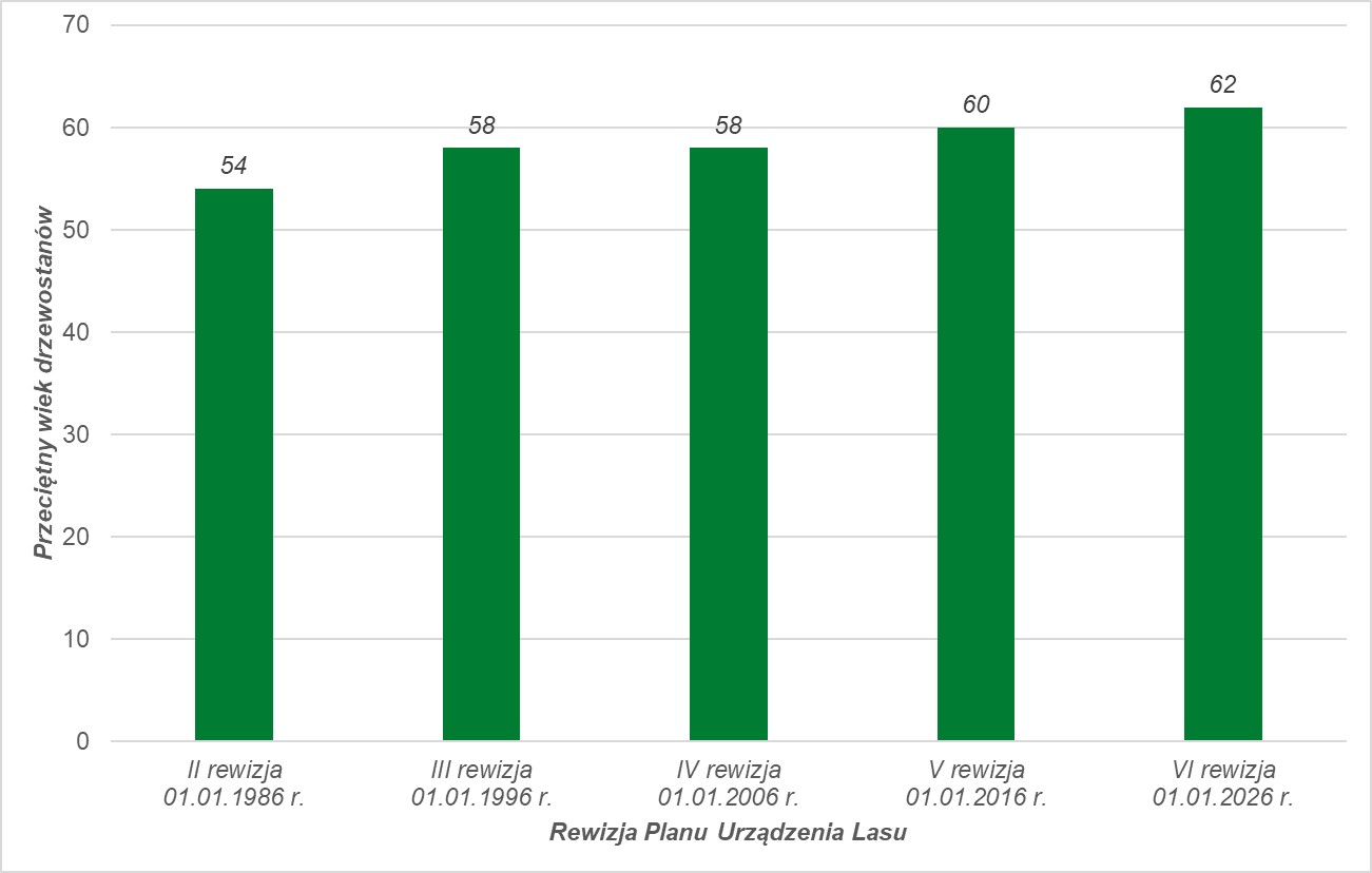 Przeciętny wiek drzewostanów w kolejnych rewizjach planu urządzenia lasu