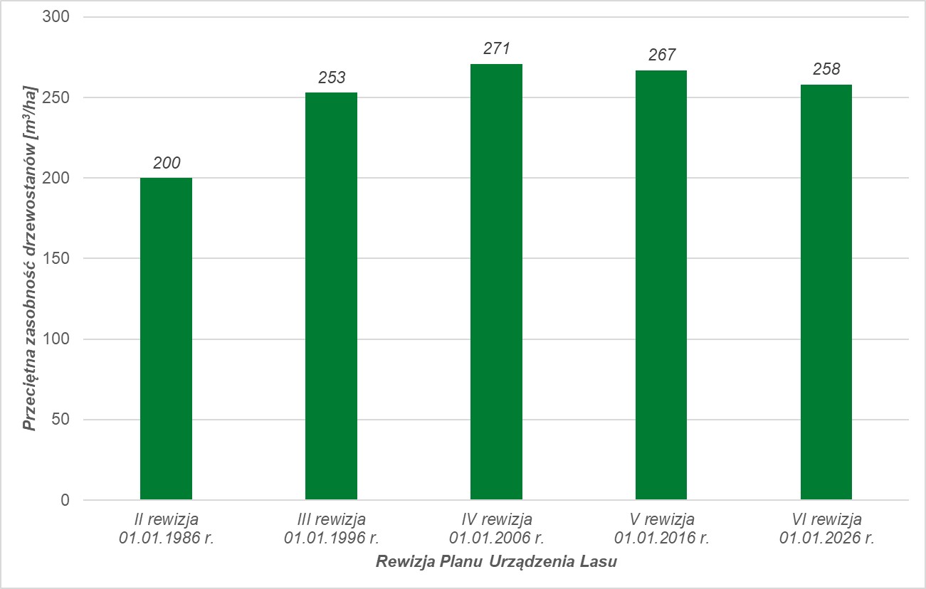 Przeciętna zasobność drzewostanów w kolejnych rewizjach planu urządzenia lasu